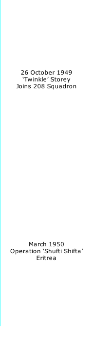 In mid-March 1950, I was pulled of the squadron and placed in the operations room at HQ 205 Group and on the 24th May the Squadron deployed to Khartoum as its main base. On the following day, eight or nine of the aircraft flew in to Asmara, Eritrea, where they supported the Royal Berkshire Regiment who were in action on the ground against the Shifta bandits. Hence the operation was known as Shufti Shifta. George Bush and Tony Blair would have classified the Shifta as international terrorists but I think they were doing what they had done for many years and are still probably doing on a minor scale: raiding the villages, stealing the cattle and raping the women.