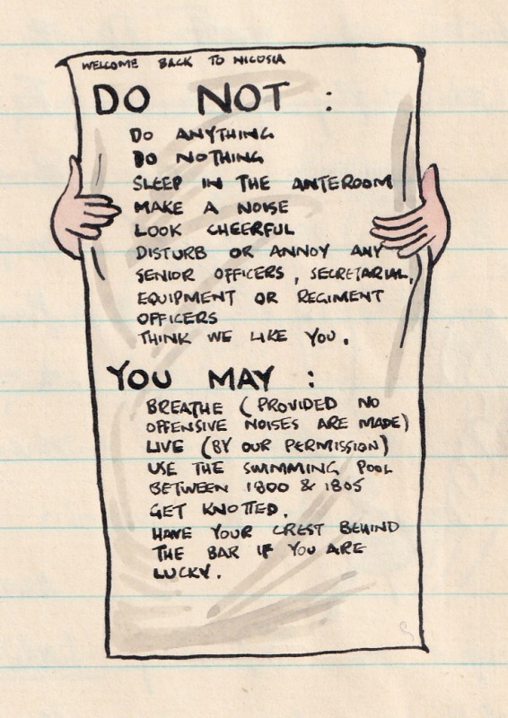 In keeping with morale on return to Nicosia the weather was wet and miserable and very uninspiring. In the evening eleven of the chasps went to a cocktail party at the home of the Deputy C-in-C, whilst those who were not on leave or living out stayed in the Mess and noticed that there was no welcoming party of any sort.