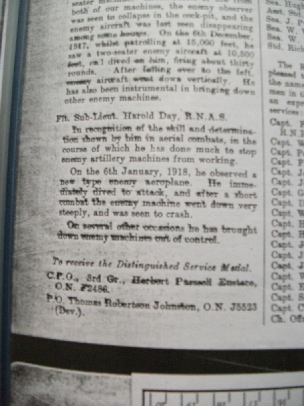 Flight Sub-LieutenantH Day DSCRoyal Naval Air Service